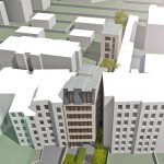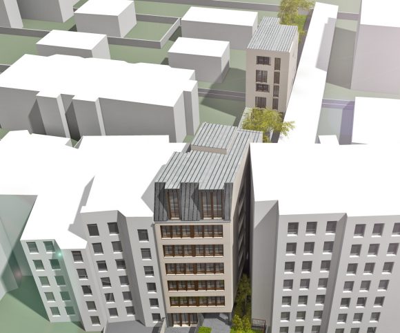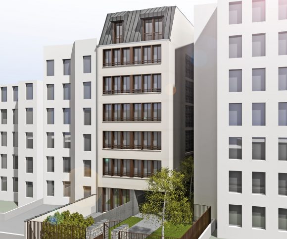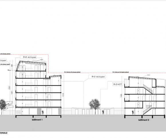Les dimensions de ces deux parcelles sont atypiques dans le secteur, il s’agit d’un long rectangle d’environ 7,50 m de large sur 105 m de long. L’implantation urbaine est dictée par deux nécessités, la fabrication d’une séquence urbaine cohérente avec les deux immeubles mitoyens à notre parcelle et la constitue d’un seul immeuble avec deux cages.