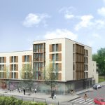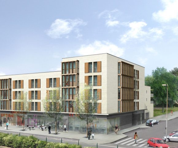 Deux ensembles de 43 logements avec commerces aux rez-de-chaussée et parking enterré sont dessinés correspondant aux deux phases proposées. Le plan urbain propose donc la possibilité de constituer une cour intérieure, lieu protégé encadré par deux bâtiments en L. Un porche d’accés donne des transparences et des vues depuis la rue sur le jardin intérieur dans lequel une ligne d’arbres montre la profondeur de la parcelle. Tous les appartements (du studios aux 5 pièces) sont soit traversants, soit à double ou triple orientations. Plusieurs critères ont présidé aux choix des trois matériaux principalement utilisés, la brique pour les murs, le bois pour la menuiserie et le zinc pour les édicules de toiture. Des matériaux connus et reconnus par tous comme ayant un air de familiarité. De même, les bow-windows trouvent ici naturellement leur place. Ils permettent d’aller chercher la lumière sur les façades les moins bien exposées et de les caractériser plus fortement. Le jardin est ici un espace structurant, il donne cohérence aux deux bâtiments jumeaux. Il est conçu dans le respect de l’environnement, des économies d’énergie et d’eau d’arrosage. Les plantations hétérogènes respectent la bio-diversité. La pente consécutive à la surélévation du parking sera plantée de gazon « sobre ». 7 arbres à petit développement plantés dans la diagonale étirent l’espace du jardin. La démarche environnementale est inhérente au projet: les choix d’orientations, de matériaux, les conforts à l’intérieur des logements, l’installation de panneaux solaires en toiture pour la production d’eau chaude sanitaire; nous n’abordons pas ces exigences de façon séparée de l’architecture.