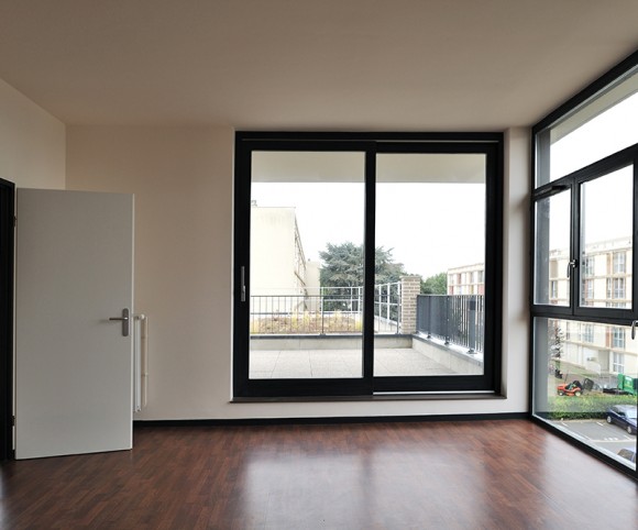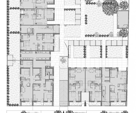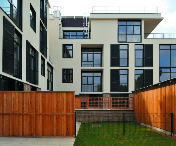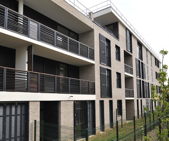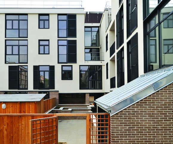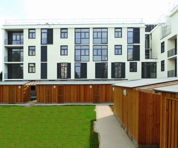 Les réponses aux questionnements du développement durable sont aussi données par les matériaux : que ce soit pour les revêtements (notamment les sols en linoléum), ou encore pour les menuiseries extérieures (bois, ou bois-alu). A l’arrière on trouve des jardins privés et un jardin partagé.