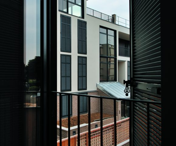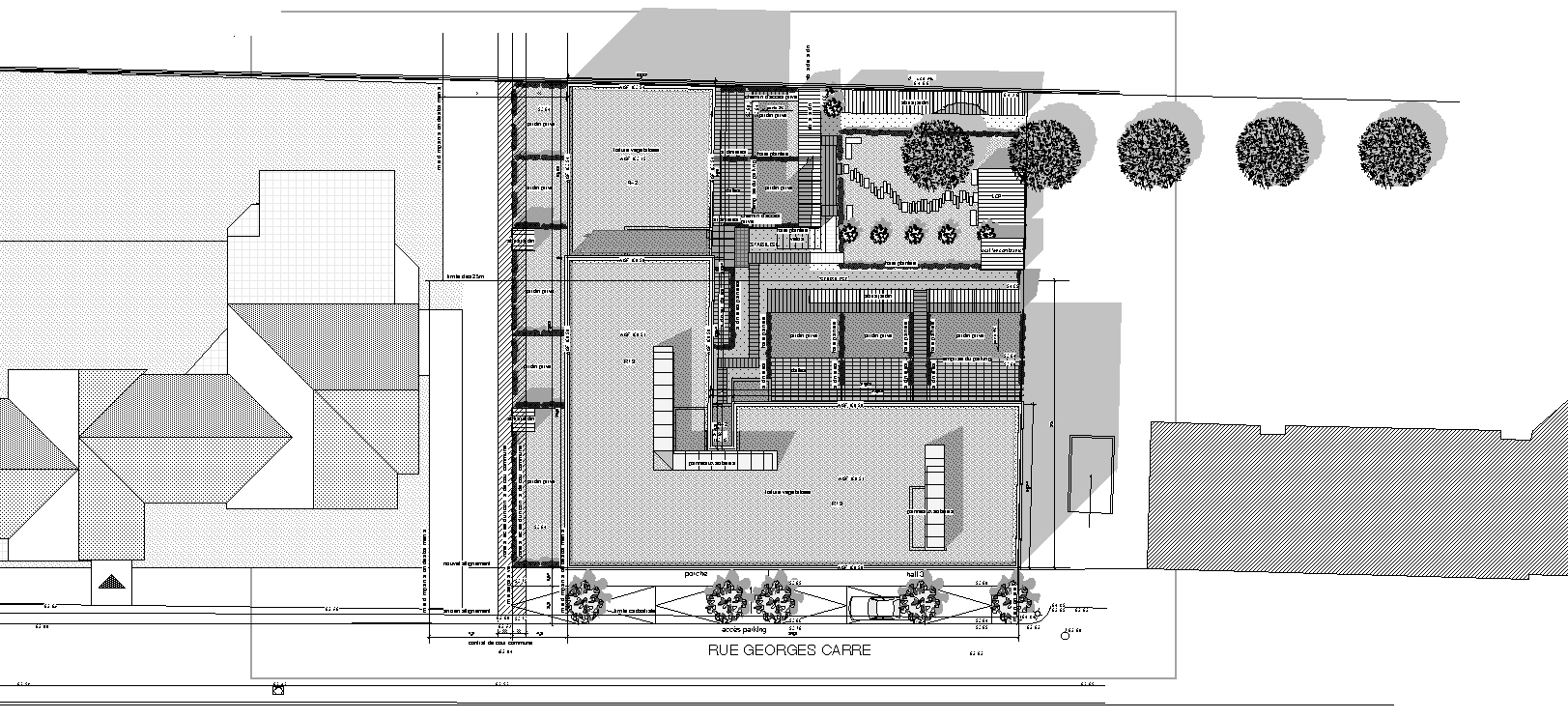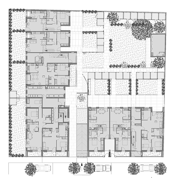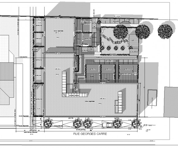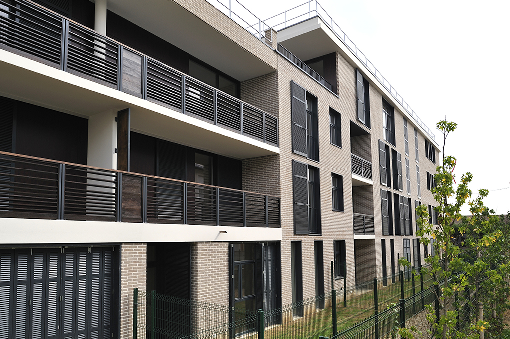 Le dessin du plan-masse en «L» permet de proposer vingt-cinq logements traversants sur trente; les cinq autres étant mono-orientés sud-est et sud-ouest. La façade sur la rue est orientée sud-est, épaisse elle permet au rez-de-chaussée d’être protégé par un léger recul. Cet espace végétalisé est marqué par un mur bahut surmonté d’une grille. Aux étages, des loggias filantes permettent les protections solaires et le recul aux vues des passants et des voisins.
