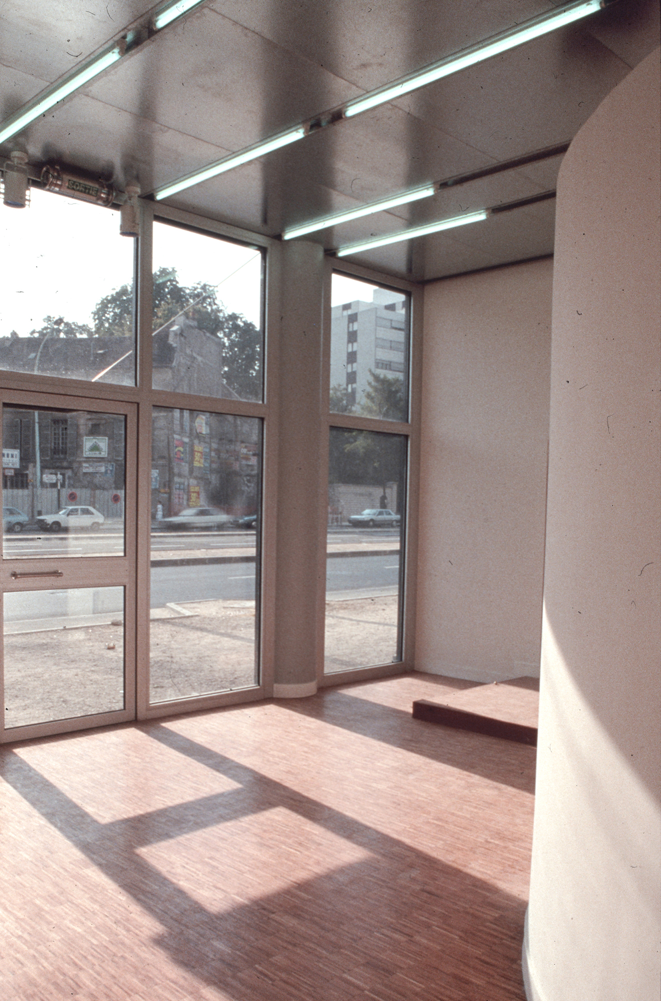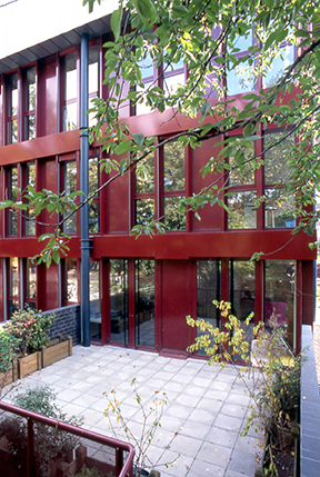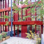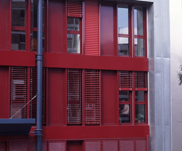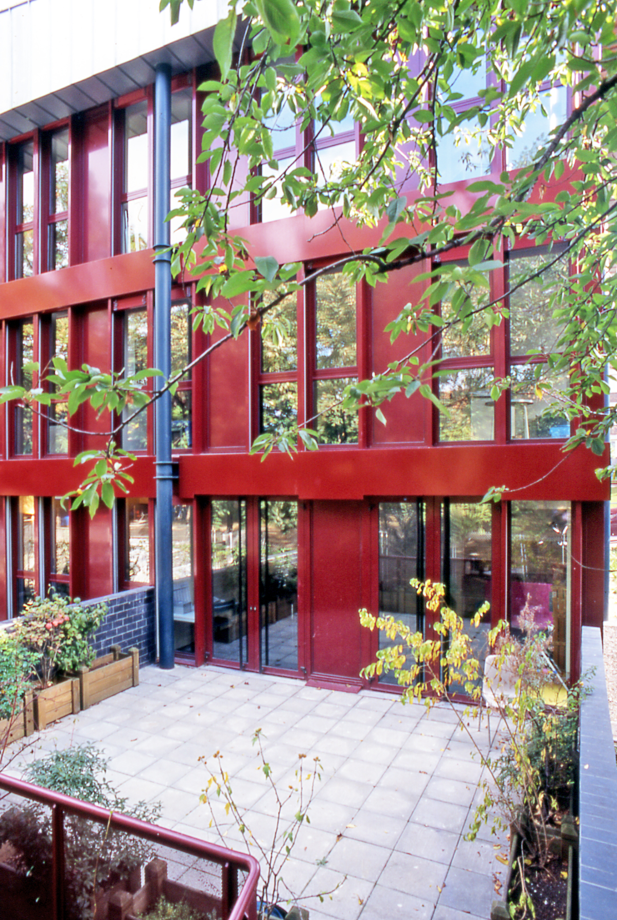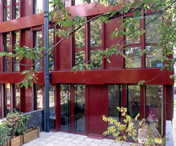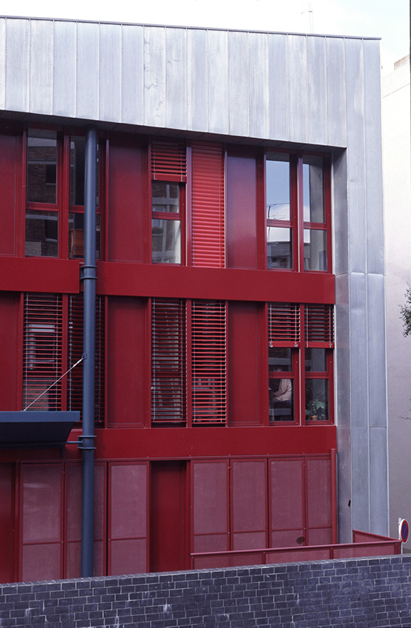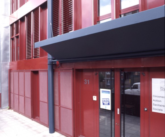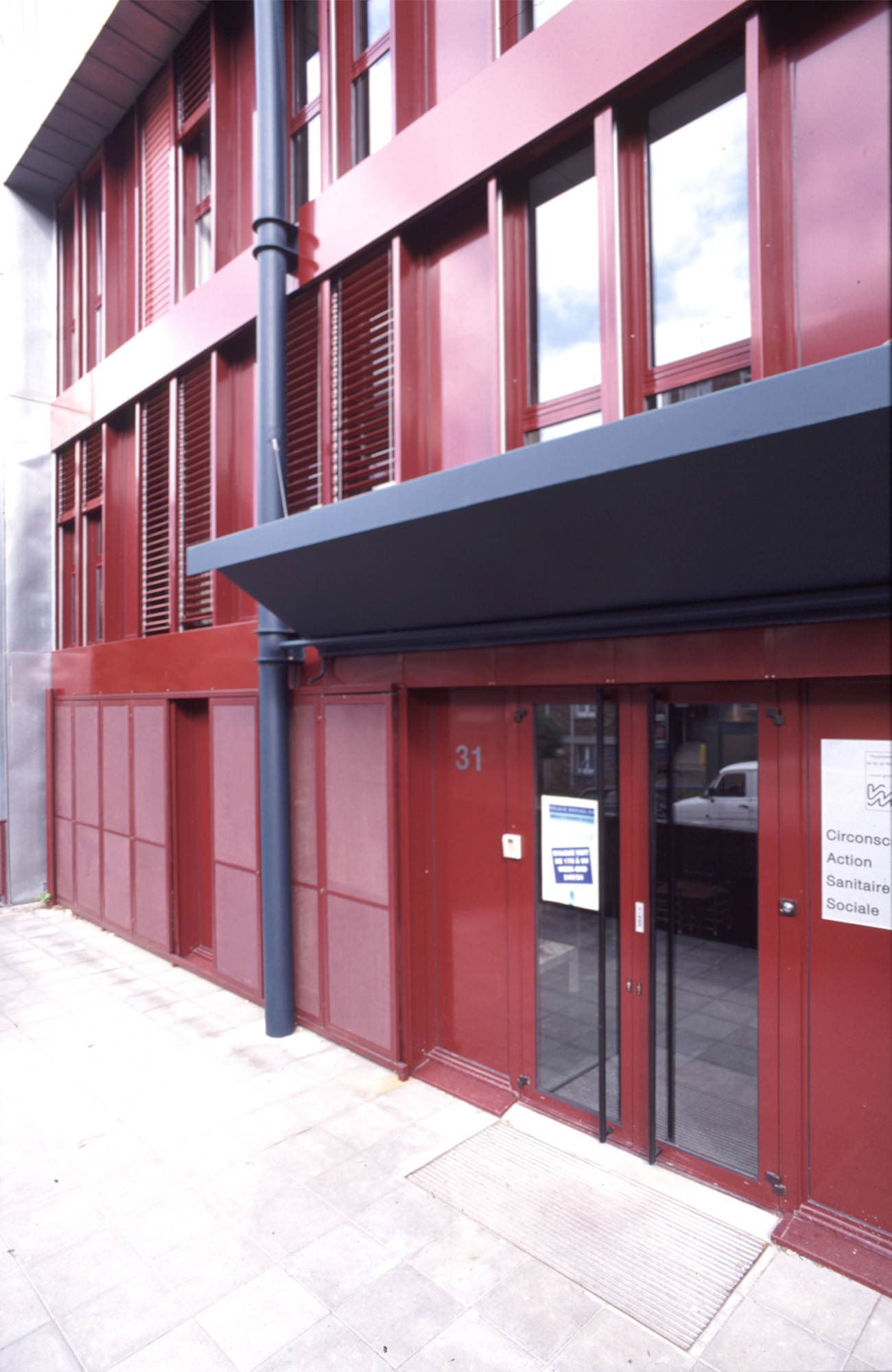De plan carré, éclairé sur trois côtés, cet édifice singulier accueille les locaux de l’Action Sanitaire et Sociale du Val-de- Marne, un programme composé d’un hall public et de bureaux. Construit en charpente métallique à poteaux extérieurs, habillé de tôles d’acier rouge qui renvoient aux briques des immeubles voisins, ce volume compact tire son efficacité plastique de sa simplicité et d’un ensemble de détails discrets. L’absence de poteaux d’angle, l’intégration des coulisses des stores, et le renvoi des eaux pluviales capoté de zinc, qui ourle le mur arrière et retourne à la verticale l’habillage du toit.