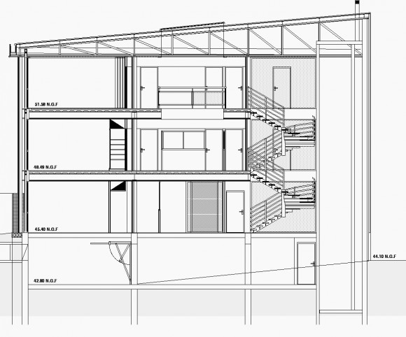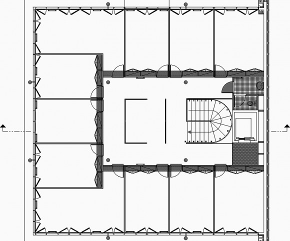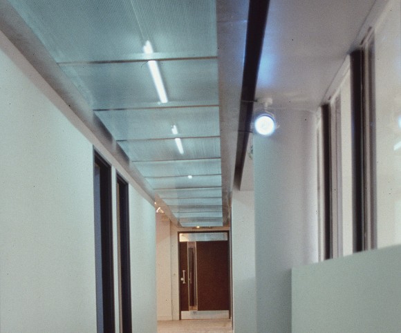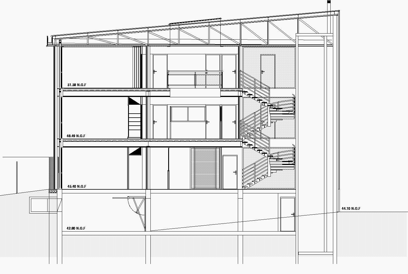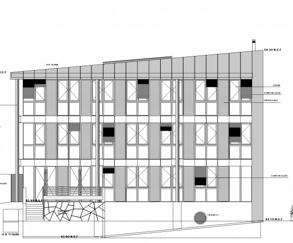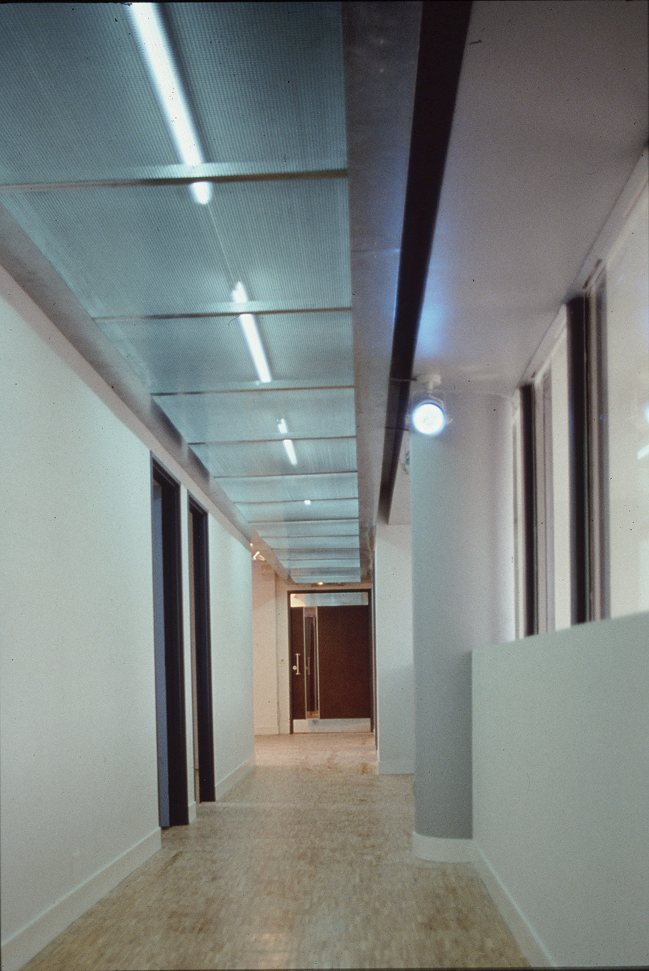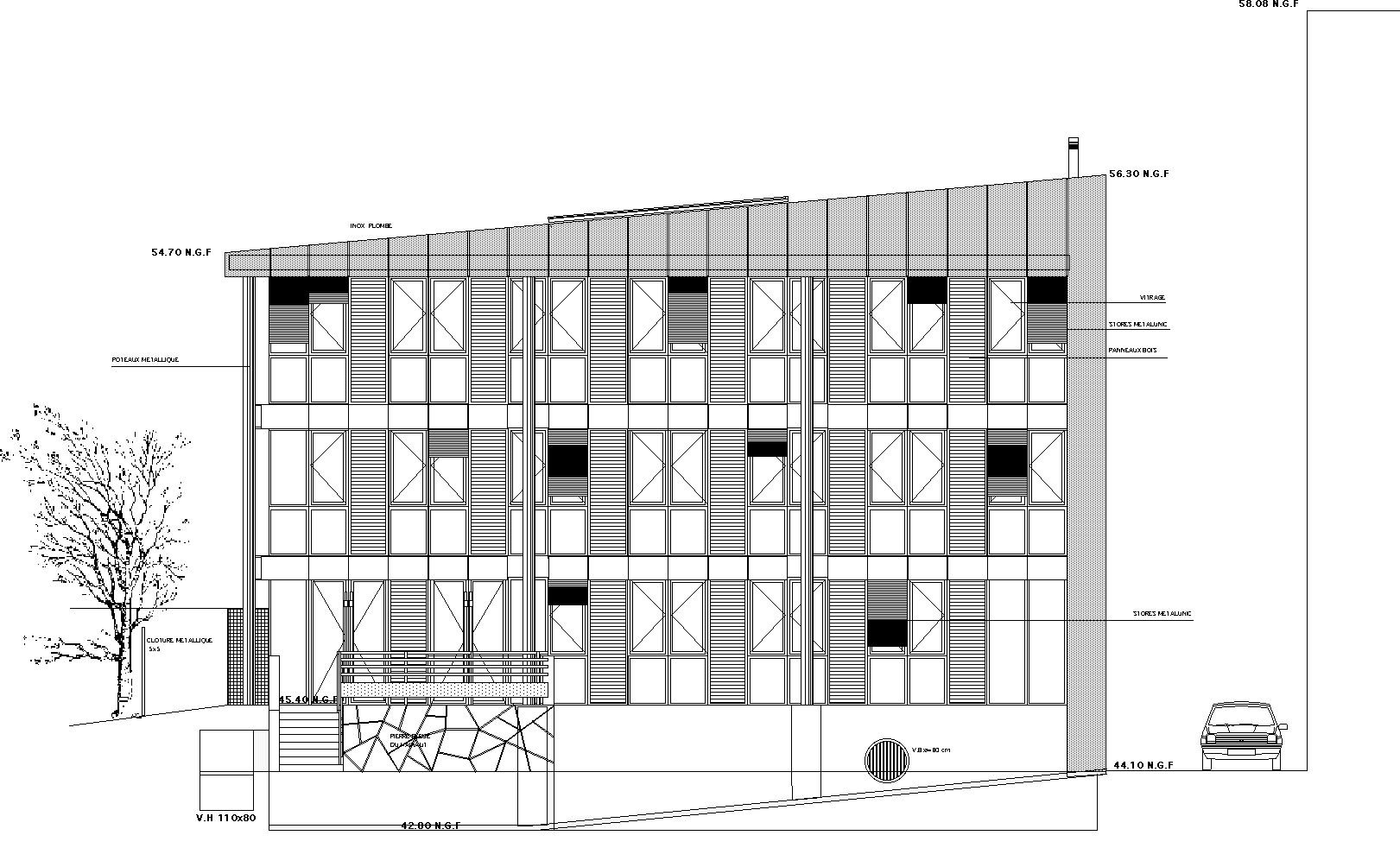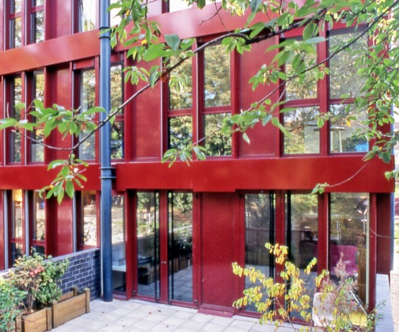 De plan carré, éclairé sur trois côtés, cet édifice singulier accueille les locaux de l’Action Sanitaire et Sociale du Val-de- Marne, un programme composé d’un hall public et de bureaux. Construit en charpente métallique à poteaux extérieurs, habillé de tôles d’acier rouge qui renvoient aux briques des immeubles voisins, ce volume compact tire son efficacité plastique de sa simplicité et d’un ensemble de détails discrets. L’absence de poteaux d’angle, l’intégration des coulisses des stores, et le renvoi des eaux pluviales capoté de zinc, qui ourle le mur arrière et retourne à la verticale l’habillage du toit.