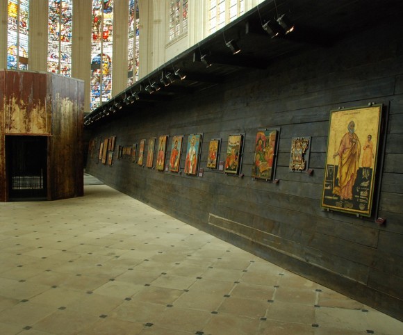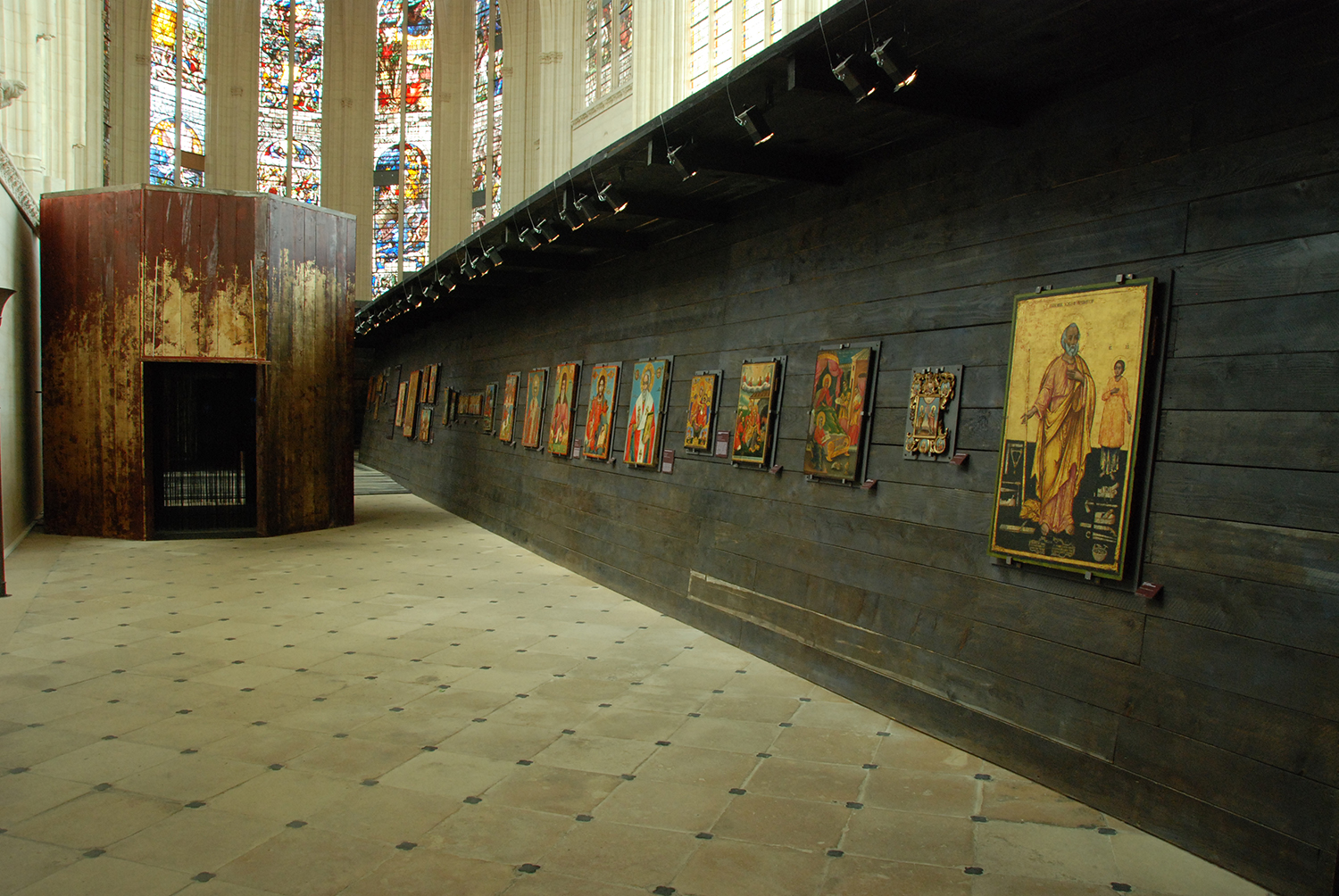 objets/meubles habités, traversables, supports des œuvres. Le premier comme couloir des icônes, le second reconstitution d’une iconostase, le troisième abri des bibles, le dernier en forme de cylindre Ces objets proposent un double parcours, le premier est consacré au regard sur les icônes, le second met en place des perspectives nouvelles permettant de découvrir la Sainte Chapelle dans des angles