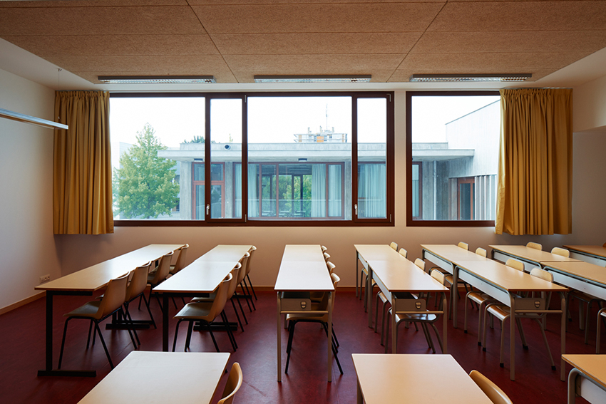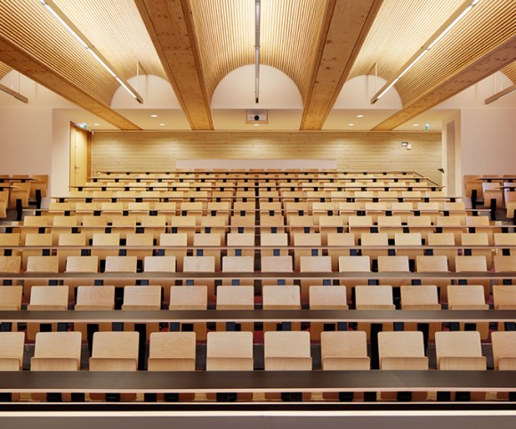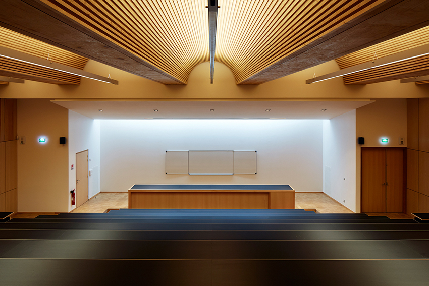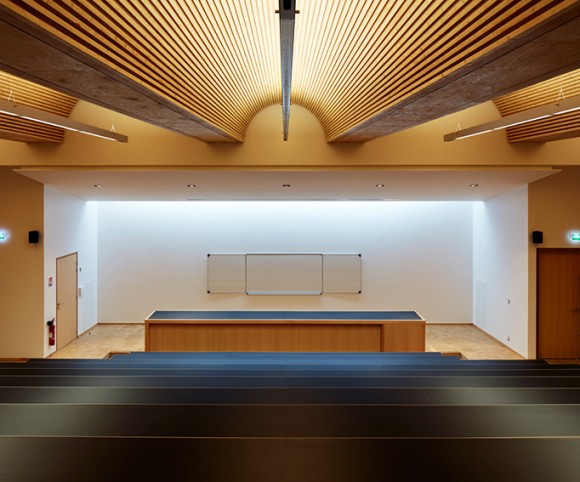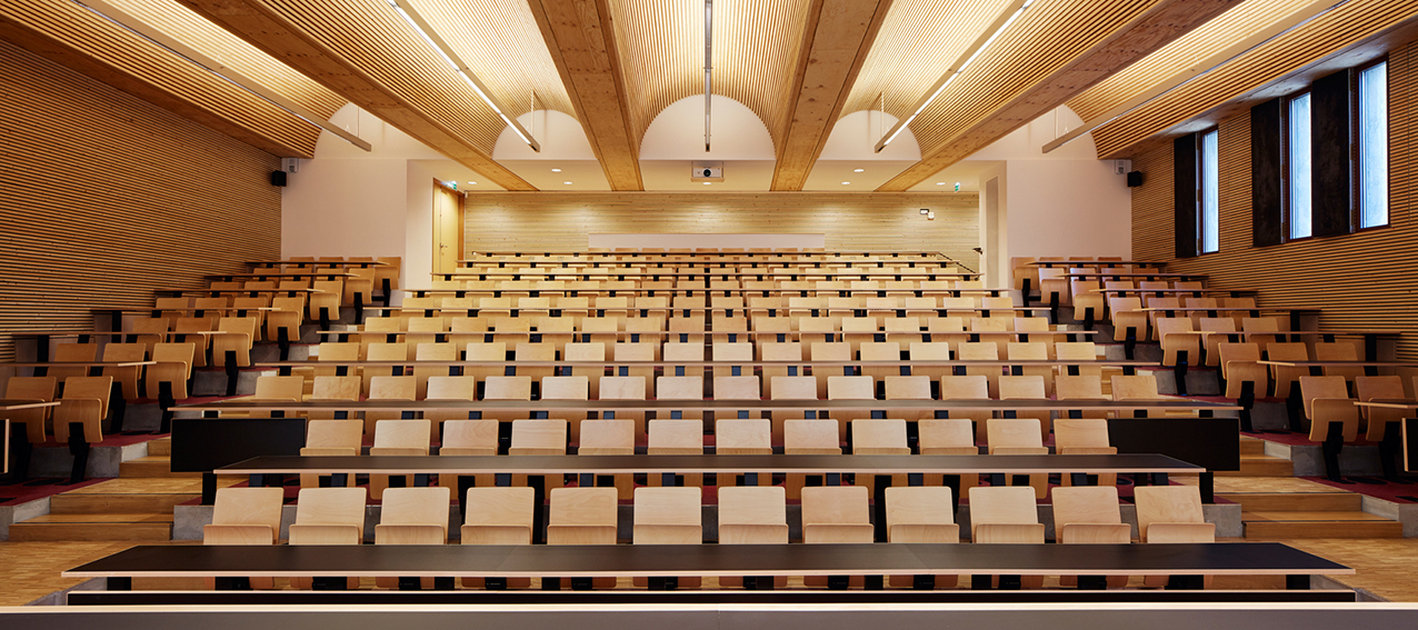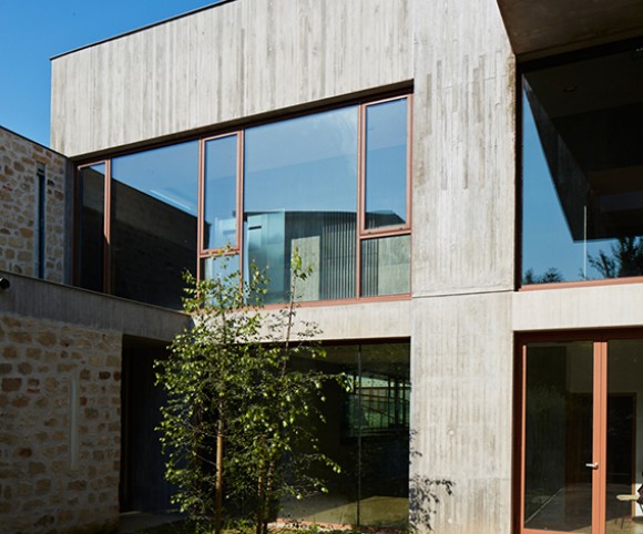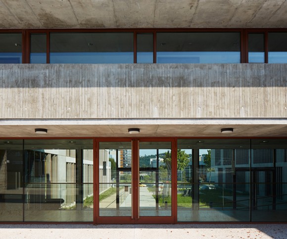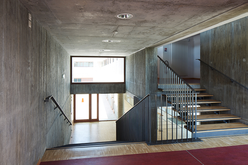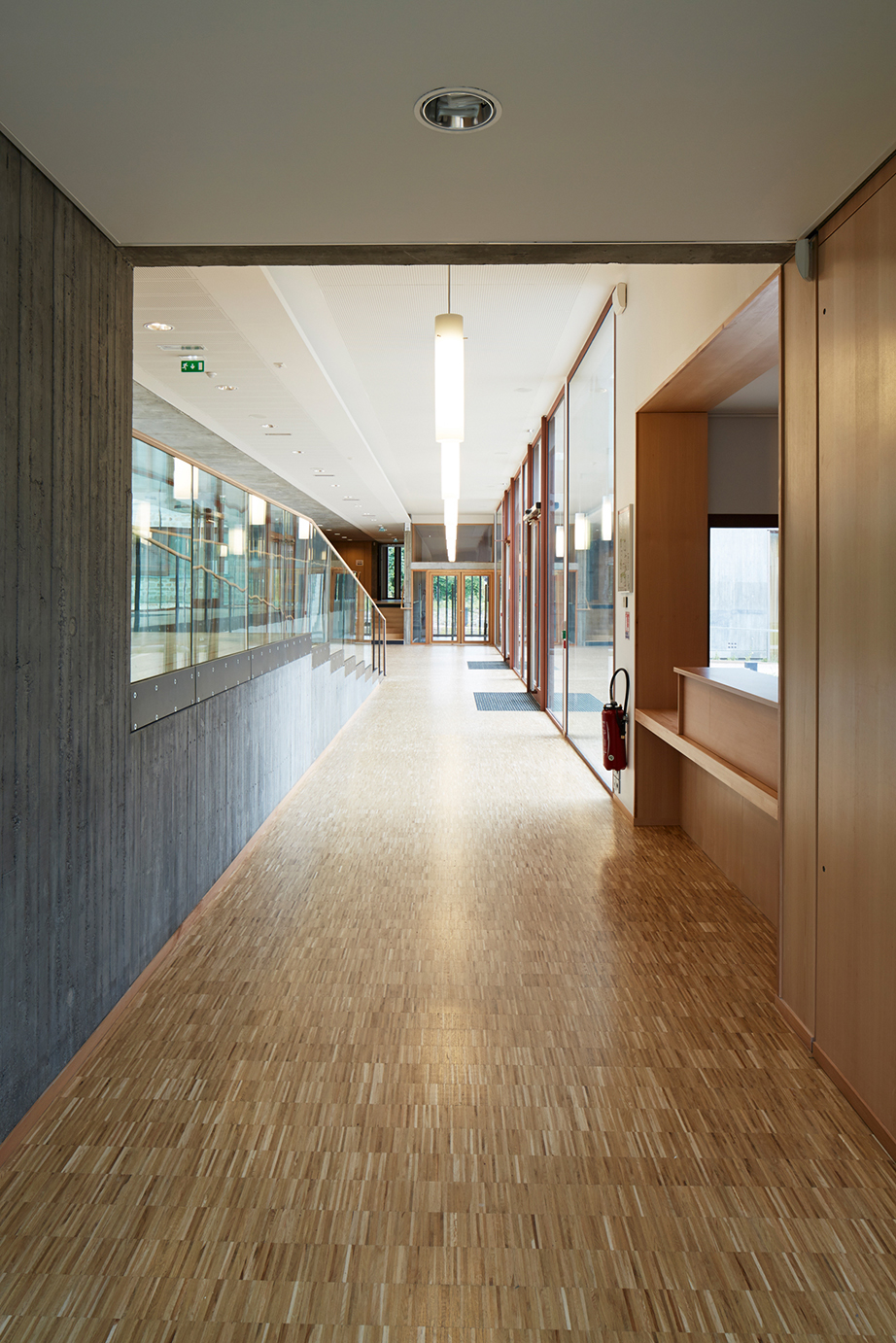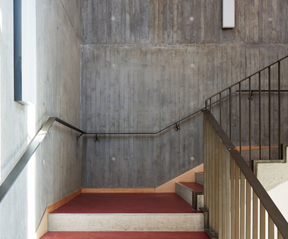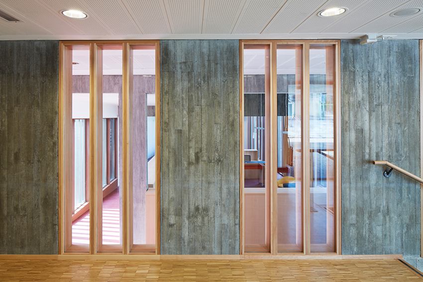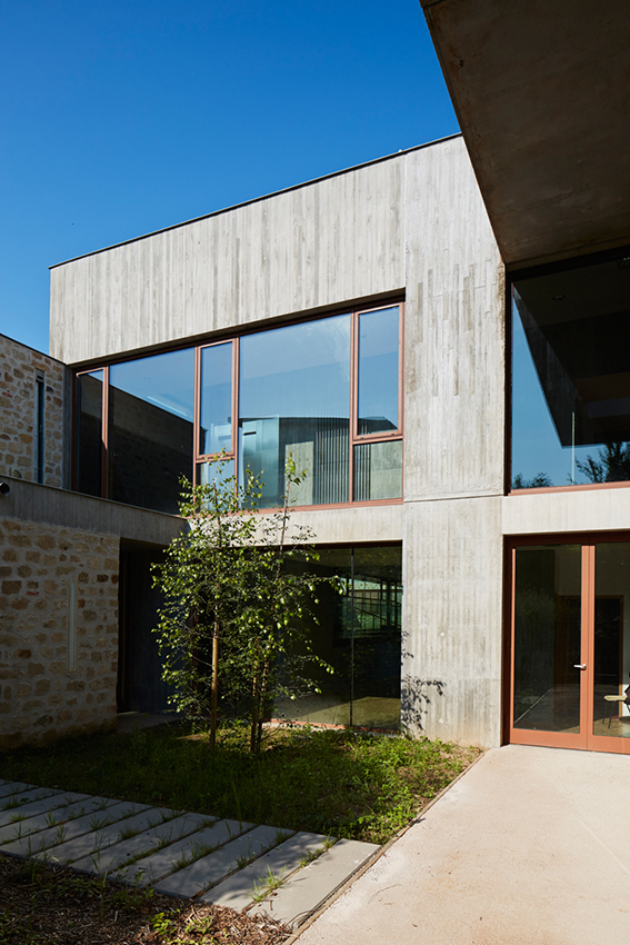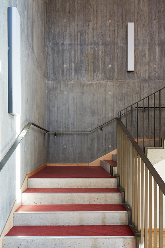 Le mode structurel adopté rend compte d’une vérité constructive visible, structure de béton brut de planches appareillés, charpente bois visible pour les l’amphithéâtre et le hall d’essai, couverture de zinc, réutilisation de pierres existantes sur le site.