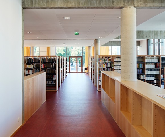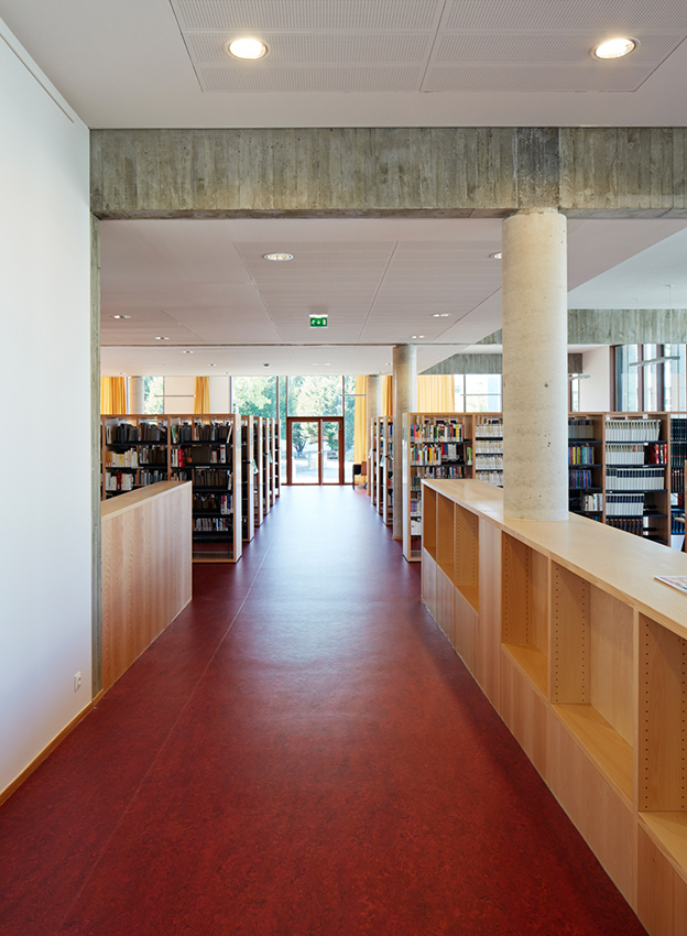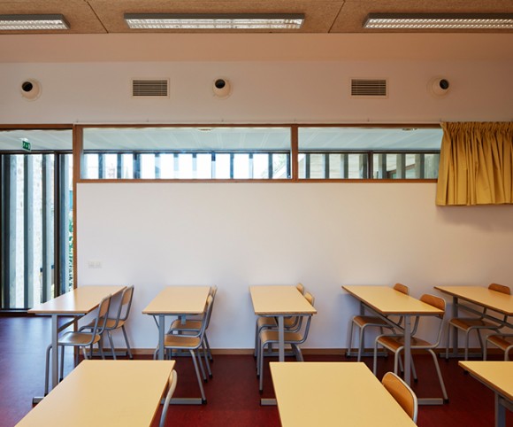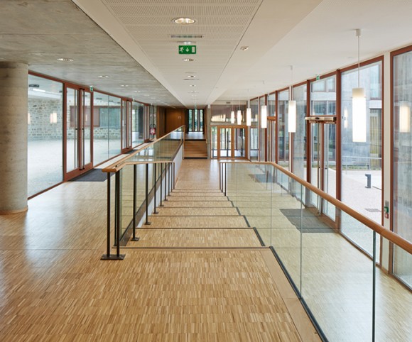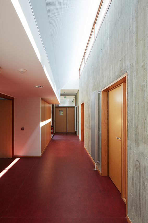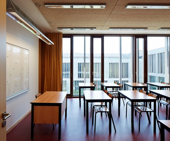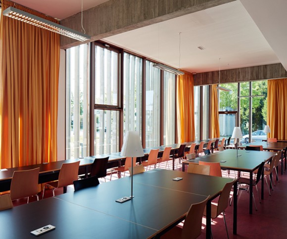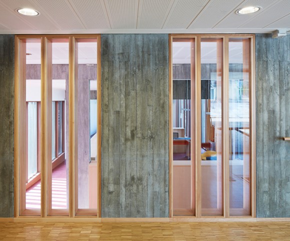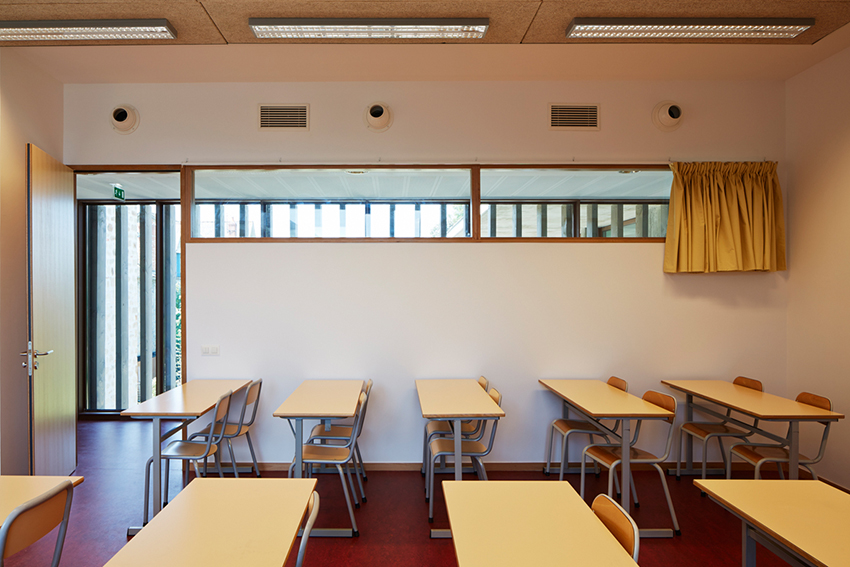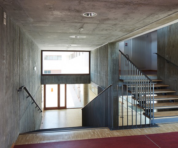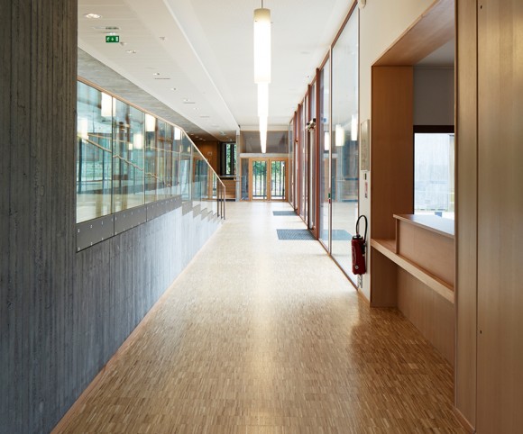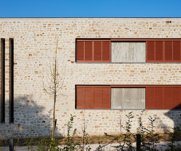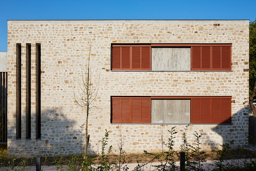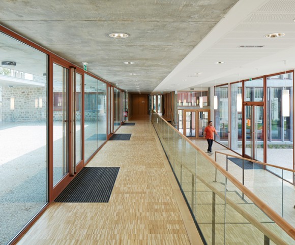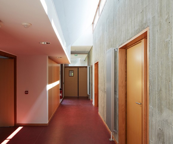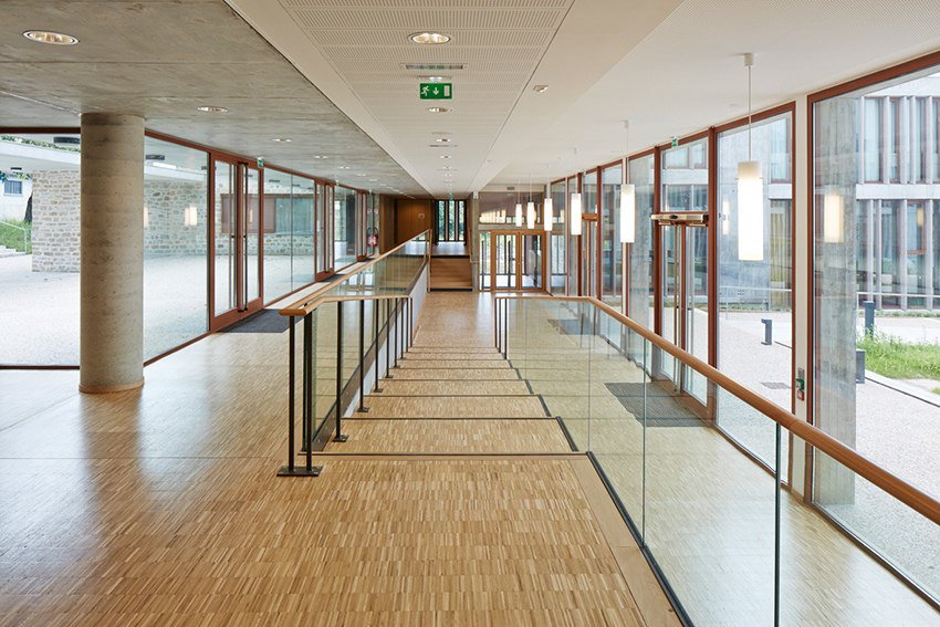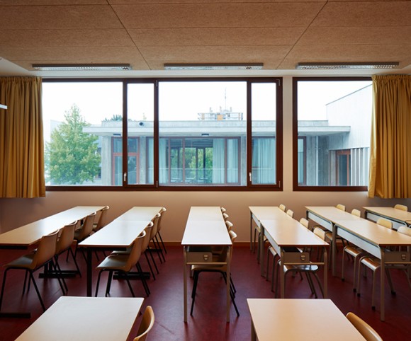 Le mode structurel adopté rend compte d’une vérité constructive visible, structure de béton brut de planches appareillés, charpente bois visible pour les l’amphithéâtre et le hall d’essai, couverture de zinc, réutilisation de pierres existantes sur le site.