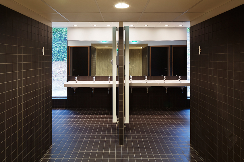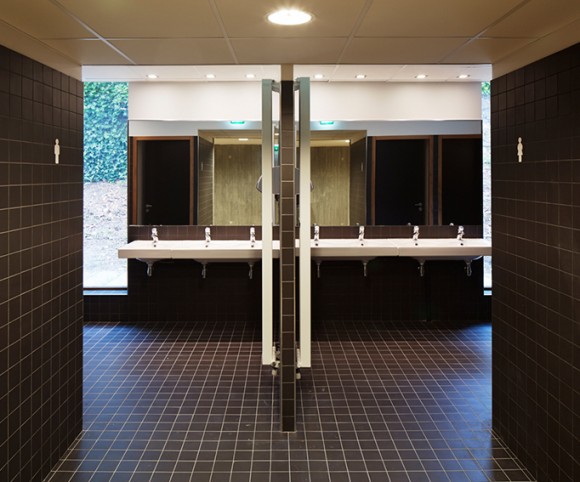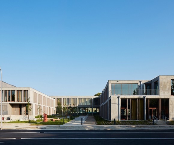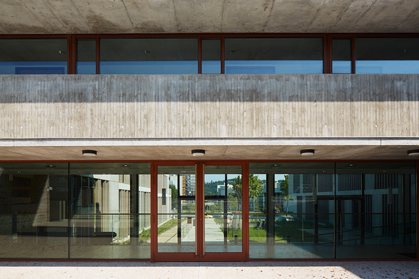 Entre les deux, un vaste parvis en décaissé, on accède en passant sous un large auvent au hall distributif.