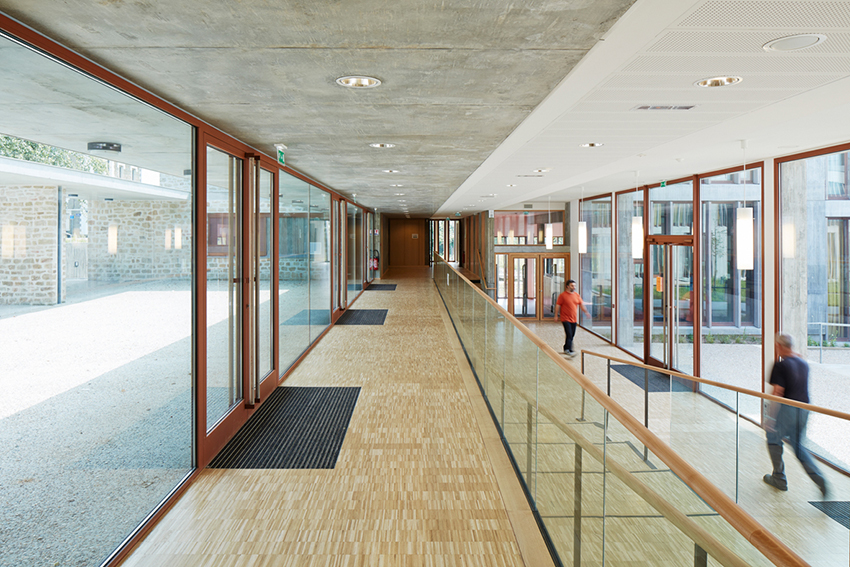 Ce hall se présente comme une galerie transversale aménagée sur deux niveaux et reliant les deux ailes de l’édifice. Traversant et accessible des deux côtés, il est totalement transparent et relie visuellement les deux rues, haute et basse.