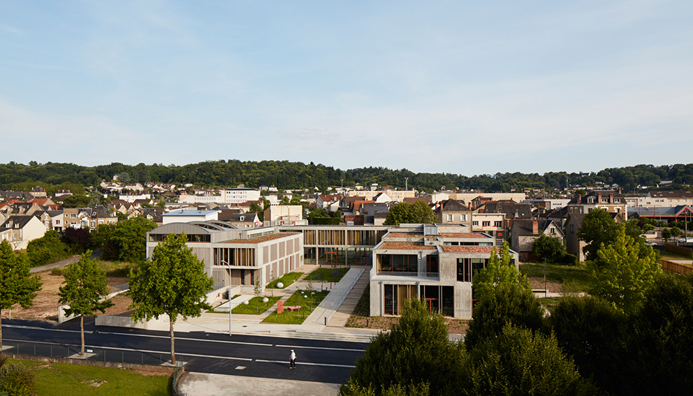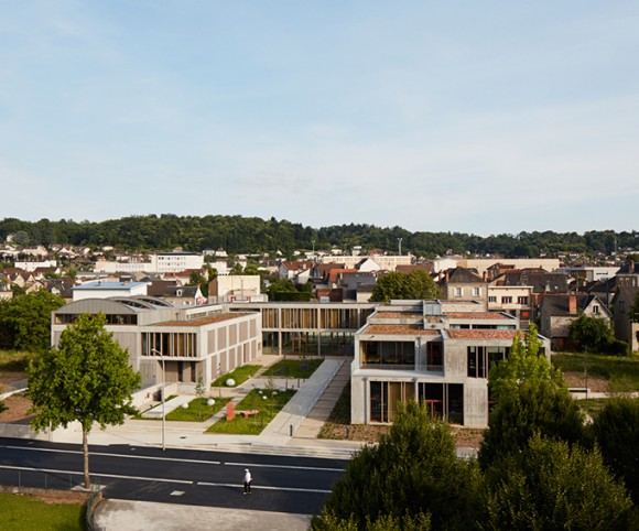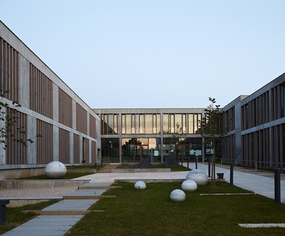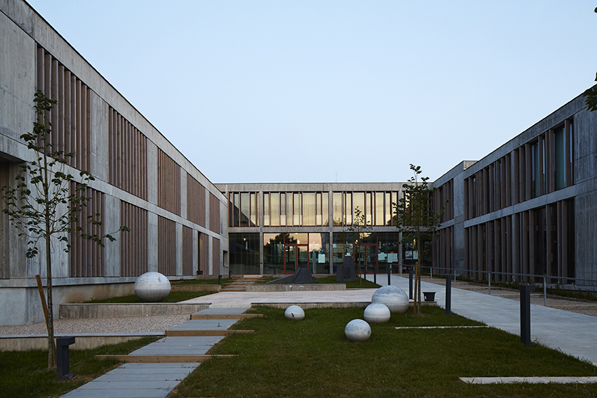Le pôle universitaire prend la forme en plan d’un H dissymétrique, globalement orienté nord/sud. Du côté de la voie principale, les deux principaux volumes (amphithéâtre à l’est et administration à l’ouest) sont implantés approximativement sur les constructions existantes, en léger retrait de l’alignement.